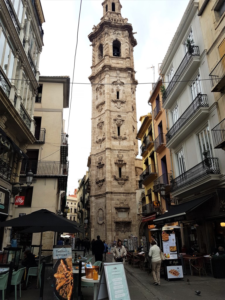 Solo vi esta torre al pasar y me detuve para sacar una foto, atirada por su belleza. Aprendí más tarde que se considera una de las más hermosas en España, y también, debido a su hechura hexagonal, una de las torres borrocas más originales de la arquitectura española. Esta hito de la ciudad es una entrada popular al barrio del Mercat, del cual os contaré un poco más tarde.