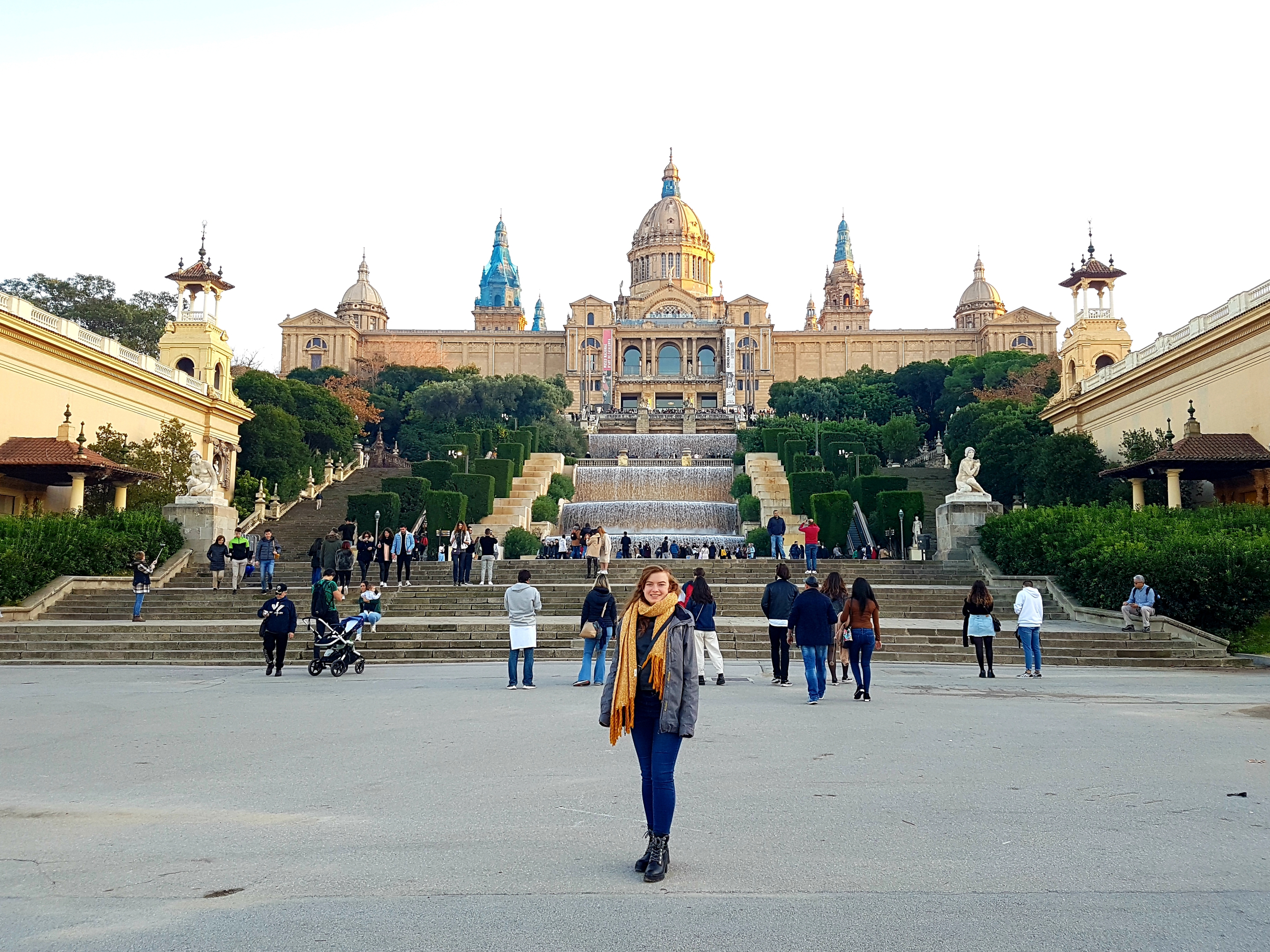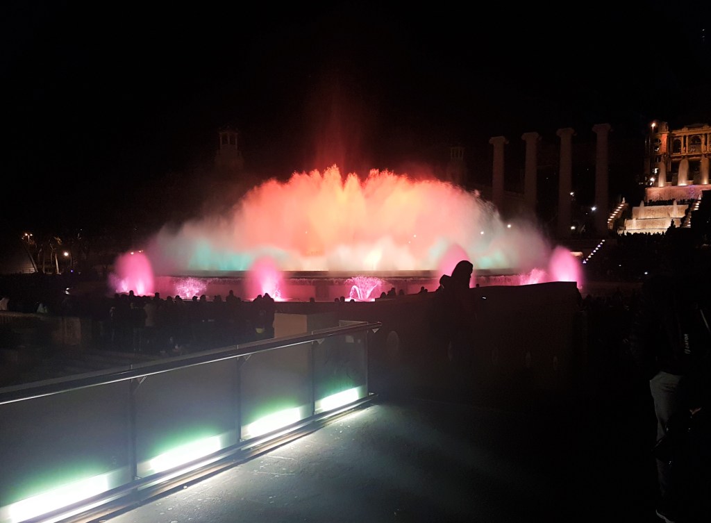 Podéis llegar al Museo Nacional de Arte de Cataluña (el edificio arriba con aspecto de realeza) por metro y luego subir la montaña de Montjuic por muchos tramos de escaleras. Después de visitarlo, esperamos cerca del fuente para ver la iluminación de la Fuente Mágica que pasa muchas veces durante todo el año. Es un espectáculo de colores, música y agua, pero ten ciudado de no estar tan cerca del fuente, ¡si no, te mojarás!
