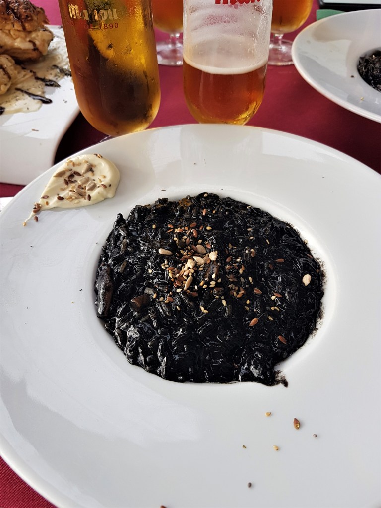 Este plato interesante aquí fue tal vez la mejor entrada de mi vida: arroz negro con chipirones (de ahí viene el color). No creo que sea algo típico de Cantabria, pero me llamó la atención por su buena pinta y sabor rico. Lo probé en el restaurante Los Castaños y los otros dos platos fueron muy ricos también.